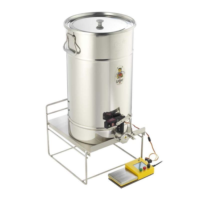De vulinstallatie is gemonteerd op ons 50-kg vulreservoir met schuine bodem voor een eenvoudiger afvoer. Een servomotor, gemonteerd op de uitloopleiding, bestuurt het sluiten van de kap van de knijpkraan. De honingvuller is ontworpen voor het halfautomatisch vullen van honing of andere vloeistoffen met een viskeuze consistentie.