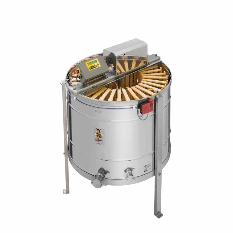 24/12-raat radiale honingslinger van Logar, met motor 180 W / 230 V, vollelektronische volautomaat-besturing en geïntegreerde veiligheidsinrichting die de motor automatisch uitschakelt bij het openen van het deksel. Moderne techniek maakt een innovatieve uitvoering van de slingerbodem mogelijk. De bodem van de ketel is naadloos gelast en naar de aftapkraan toe hellend. De slinger beschikt over twee roestvrijstalen perskranen 6/4"; één daarvan is op het laagst mogelijke punt aangebracht zodat alle honing uit de slinger kan stromen. Alle onderdelen die met honing in contact komen zijn gemaakt van voedselveilige materialen. Het deksel is van doorzichtig acrylglas.
