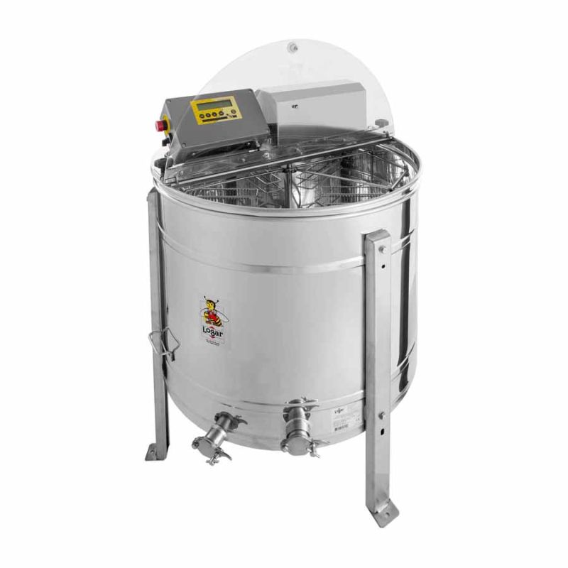 4-raams zelfwendende honingslinger met elektromotor 180 W / 230 V en volautomatische besturing. Hij heeft een geïntegreerde veiligheidsschakelaar die de motor automatisch uitschakelt bij het openen van het deksel. Moderne techniek maakte een innovatieve uitvoering van de slingerbodem mogelijk. De bodem van de ketel is naadloos gelast en naar de aftapkraan licht hellend. De roestvrijstalen knijpkraan zit op het laagst mogelijke punt zodat alle honing uit de slinger kan vloeien. Alle delen van de slinger die met honing in aanraking komen, zijn vervaardigd uit voedselveilige materialen. Het deksel is uitgevoerd in transparant acrylglas. Deze honingslinger maakt het mogelijk grotere raten te slingeren tot een hoogte van 28,6 cm. Daarom wordt het deksel met speciale scharnieren over de motor geopend.