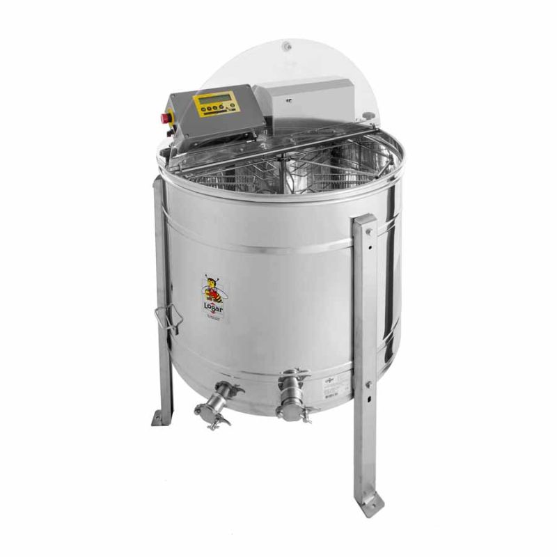 4‑ramen zelfomkerende honingcentrifuge met motoraandrijving 180 W / 230 V en volledig automatische besturing. De centrifuge is voorzien van een geïntegreerde veiligheidsschakelaar die de motor automatisch uitschakelt bij openen van het deksel. Moderne techniek zorgt voor een naadloos gelaste kuipbodem met afschot naar de aftapkraan; de roestvrijstalen aftapkraan is op het laagst mogelijk punt geplaatst zodat alle honing kan weglopen. Alle honingcontactdelen bestaan uit materialen die geschikt zijn voor levensmiddelen. Het deksel is van doorzichtig acrylglas.