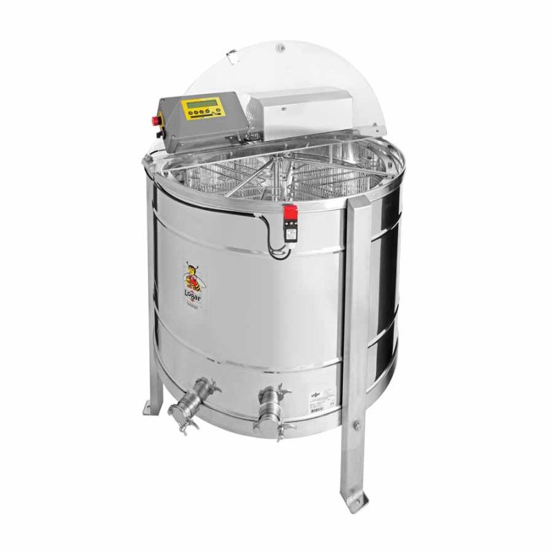6-raams zelfomkerende honingslinger van Logar, met motor 250 W / 230 V, volautomatische besturing en geïntegreerde veiligheidsinrichting die de motor bij het openen van het deksel automatisch uitschakelt. De slinger is uitgerust met twee roestvrijstalen knijpkranen 6/4''; één daarvan is op het laagst mogelijke punt geplaatst zodat alle honing kan weglopen. Alle onderdelen die met honing in aanraking komen, zijn gemaakt van voedselveilige materialen. Het deksel is van transparant acrylglas.